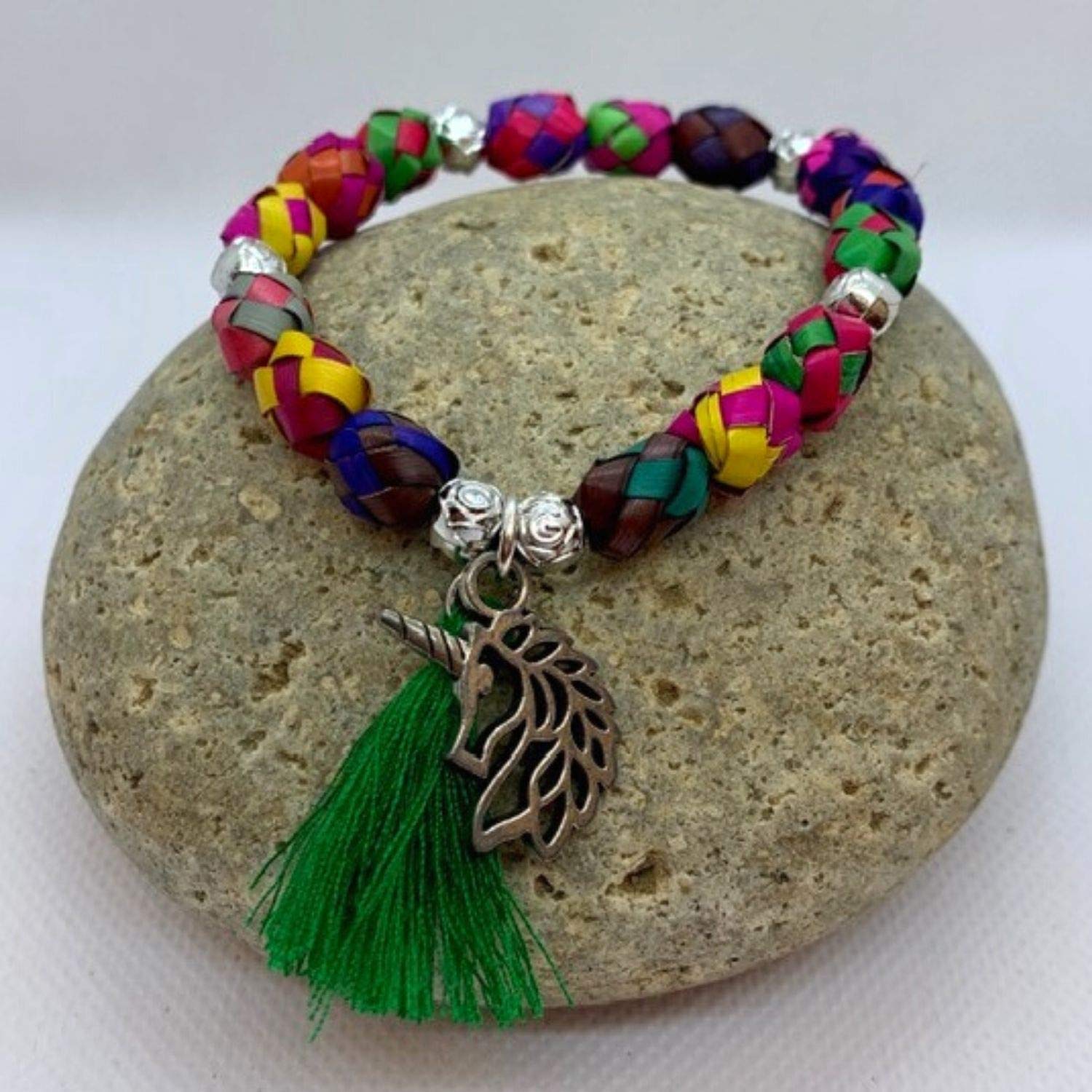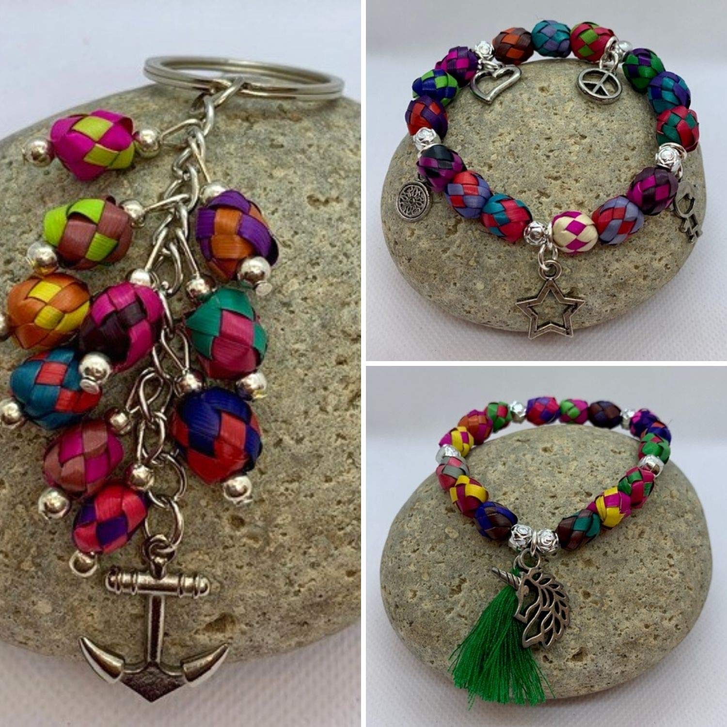 Hermoso juego de dos (2) pulseras y un llavero hechos a mano de cuentas de palma. Extraordinario trabajo realizado por artesanos mexicanos mediante el corte de Palmas que se dan en la Sierra Oaxaqueña y de Guerrero, la cual es teñida en ollas de barro y tejidas por mujeres de la región, piezas únicas llenas de siglos de tradición. Incluye: 1 pulsera con cinco dijes níquel (buena suerte), 1 pulsera con un dije de níquel (unicornio: fuerza, sueños, ilusiones y libertad), 1 llavero de cuentas de palma con dije de ancla (representa firmeza, solidez, tranquilidad y fidelidad) TAMBIÉN INCLUYE: Bolsa de organza para conservarlo en excelente estado o para dar un regalo más que perfecto y especial.