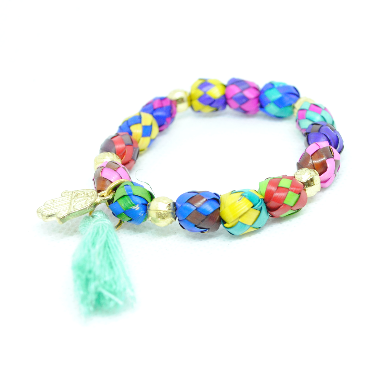 CUENTAS DE PALMA: Extraordinario trabajo realizado por artesanos mexicanos mediante el corte de Palmas que se dan en la Sierra Oaxaqueña y de Guerrero, donde la palma es sembrada y cuidada hasta que crece al tamaño maduro, un proceso cuidadoso, para después dejarle secar al sol y teñirle de manera artesanal en ollas de barro, para ser tejidas por la mujeres de la región, una TRADICIÓN DE SIGLOS Piezas únicas, llenas de valor y folklore mexicano.