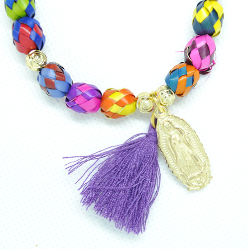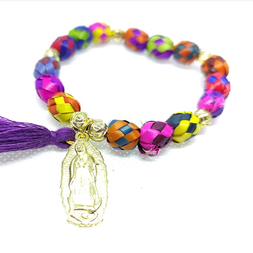 Hermosa pulsera artesanal del palma, hecha a mano con palma en varios colores, con dije de Virgen de Guadalupe en Nikel en color dorado y chaquirón. *El color del chaquirón puede variar. INCLUYE: Bolsa de organza para conservarlo en excelente estado o para dar un regalo más que perfecto y especial.