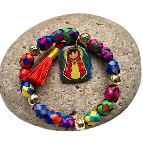 Hermosa pieza artesanal. Pulsera de Palma para niña, con imagen en acrílico de la Virgen de Guadalupe. INCLUYE: Bolsa de organza para conservarlo en excelente estado o para dar un regalo más que perfecto y especial.