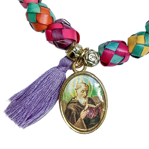 Pulsera artesanal hecha con Palma, con imagen en acrílico de San Benito. Hermoso diseño para llevar en toda ocasión. INCLUYE: Bolsa de organza para conservarlo en excelente estado o para dar un regalo más que perfecto y especial.